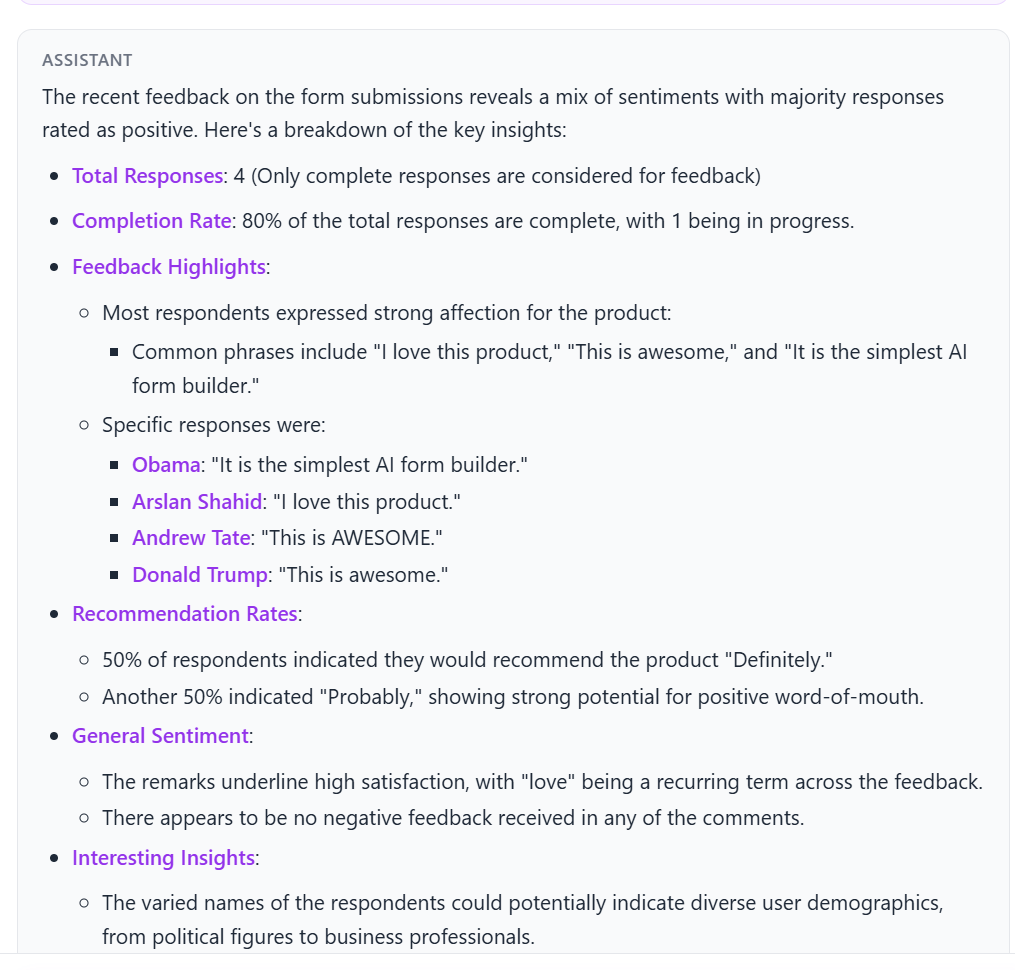 One of our core features is the ability to analyze submissions and analytics from your form. The AI agent has access to your submissions, and the form analytics.