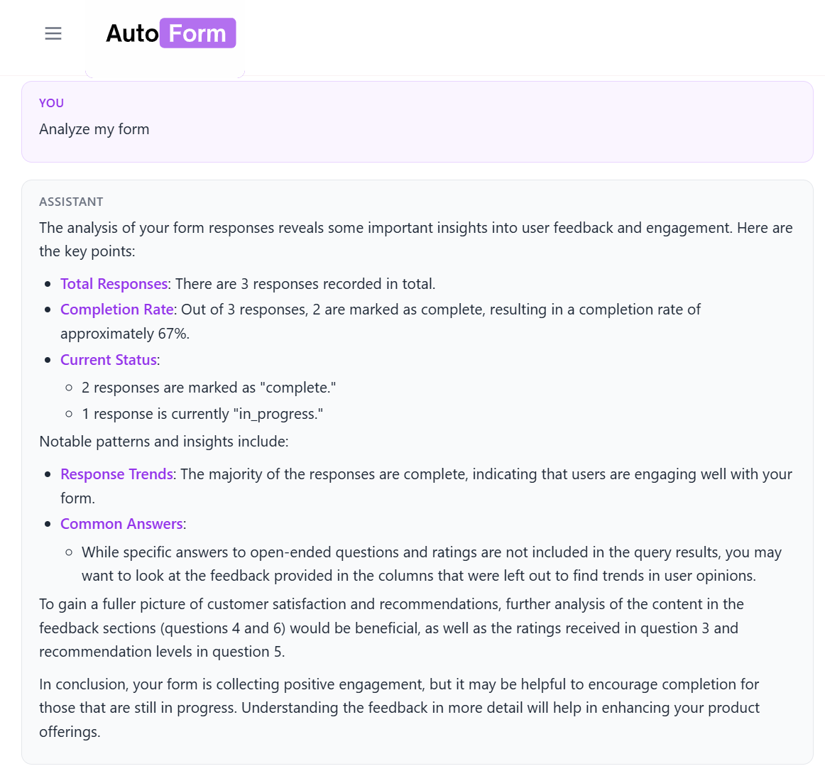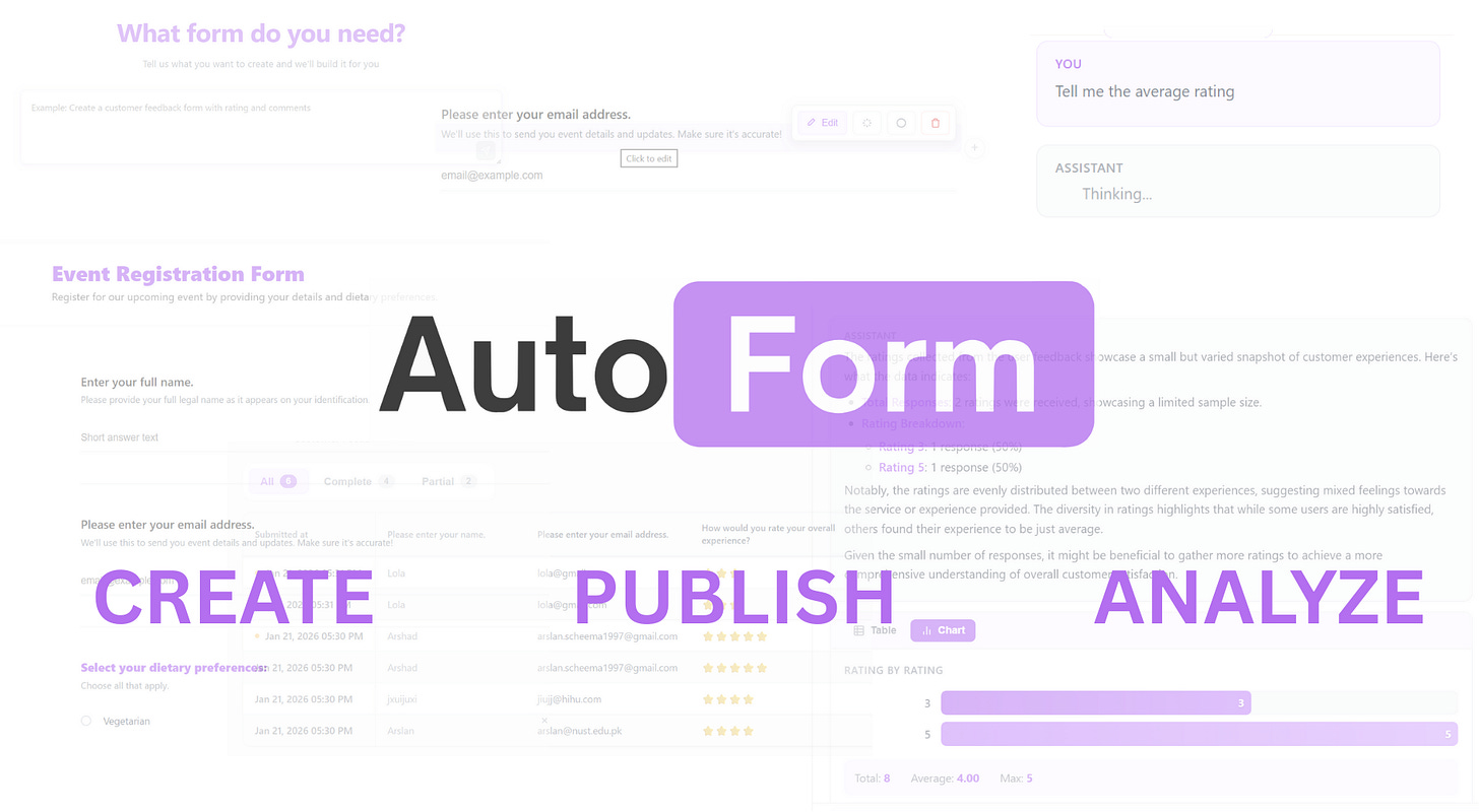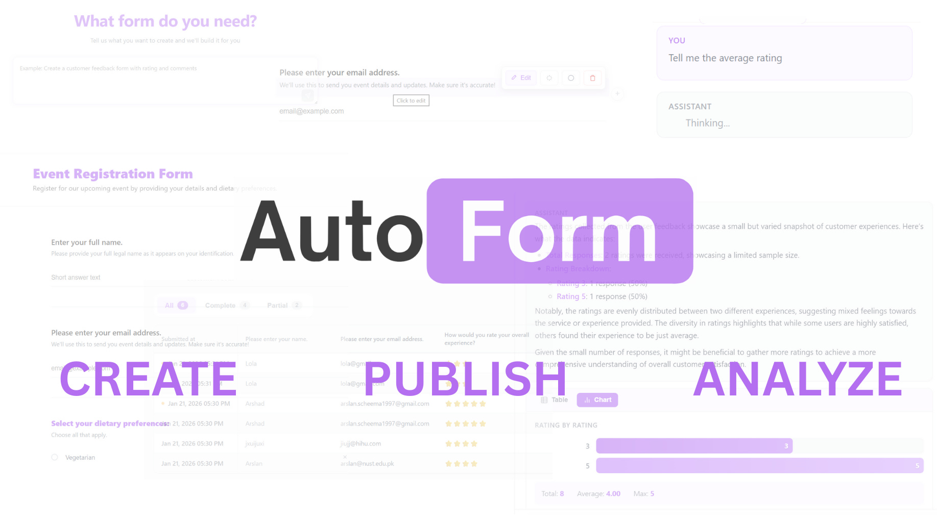 Autoform is designed with simplicity in mind. It takes you from creating -> analyzing your responses in minutes. AI is not just a feature but the entire product!