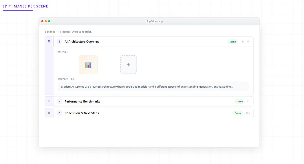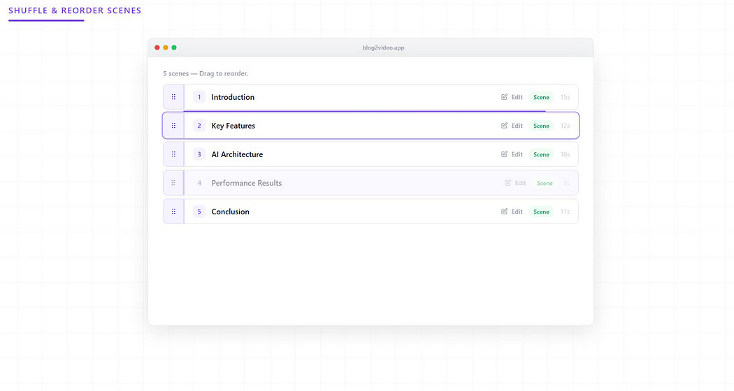 Want to rearrange your video? Just grab a scene and drag it where you want it. The entire video updates instantly. It makes iterating on your story flow incredibly fast.