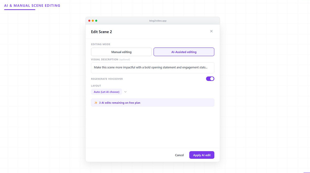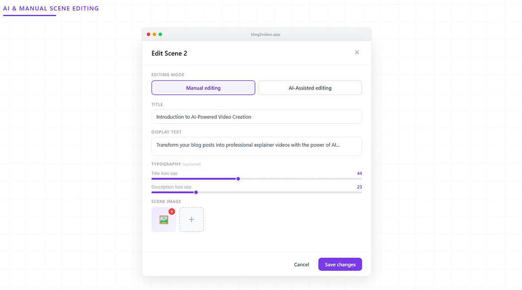 This is the one we’re most proud of. You can now edit every scene in your video — manually or with AI.