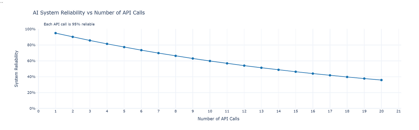 Even if a LLM call has a 95% probability of generating the correct output, and your program relies on 10 API calls every run. The probability of a reliable output from the system is (0.95)¹⁰ = 0.598 or 60%. You should try to achieve your task with the least amount of LLM calls. A system that gets the job done in 2 calls as opposed to 3 is exponentially better.