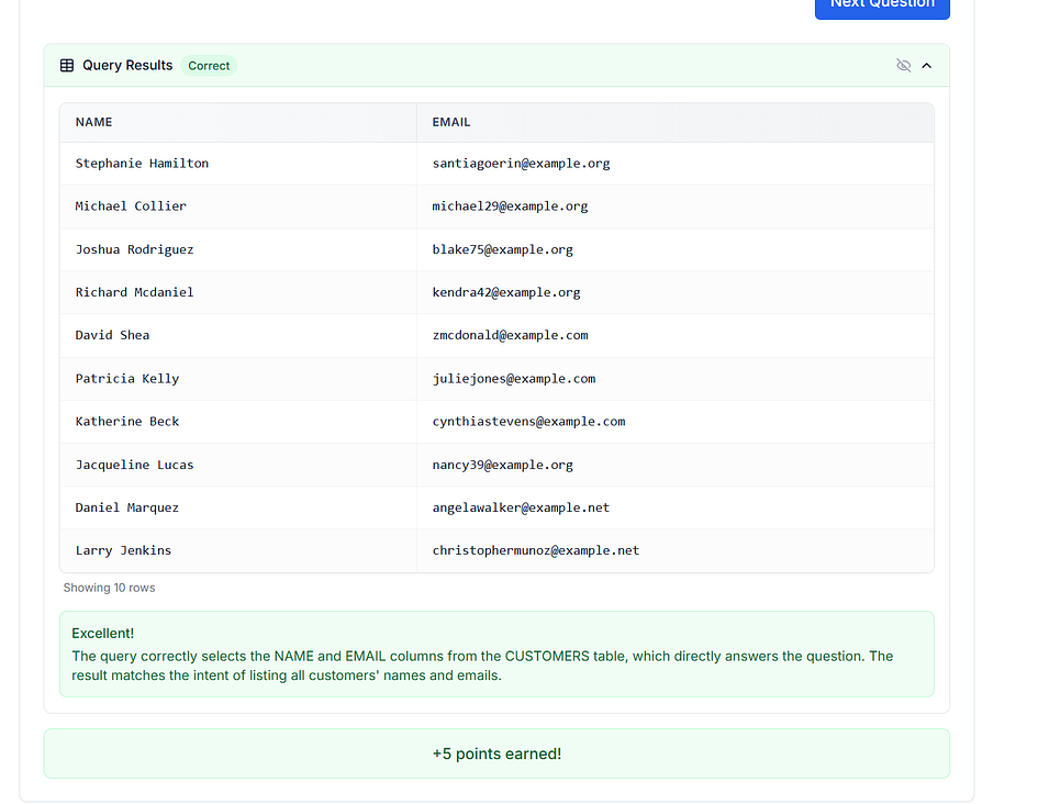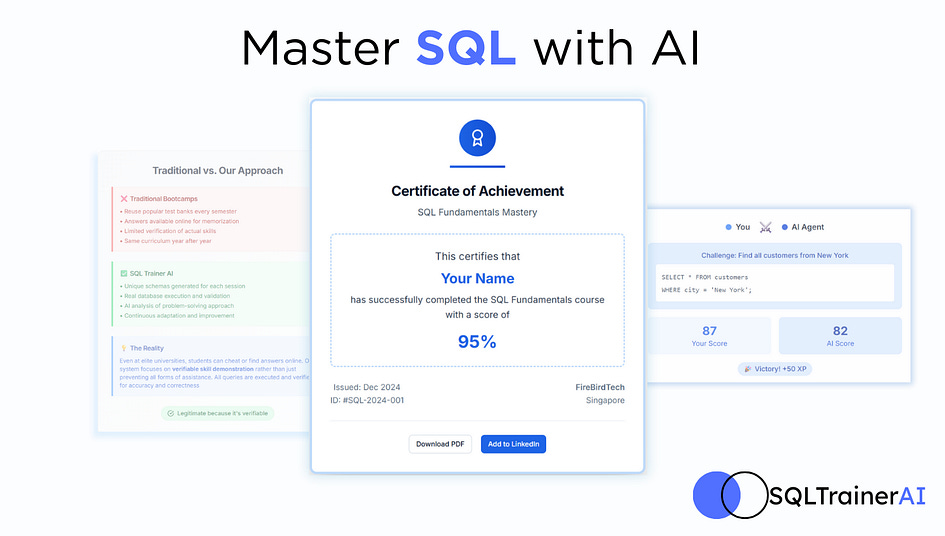 Unlike traditional bootcamps that recycle the same test banks and allow answers to be found online, SQL Trainer AI generates unique schemas for every session, executes queries against real databases, and validates results for accuracy.