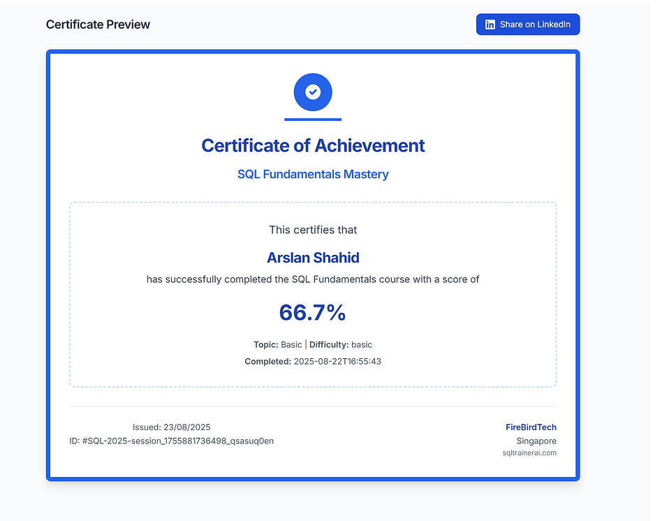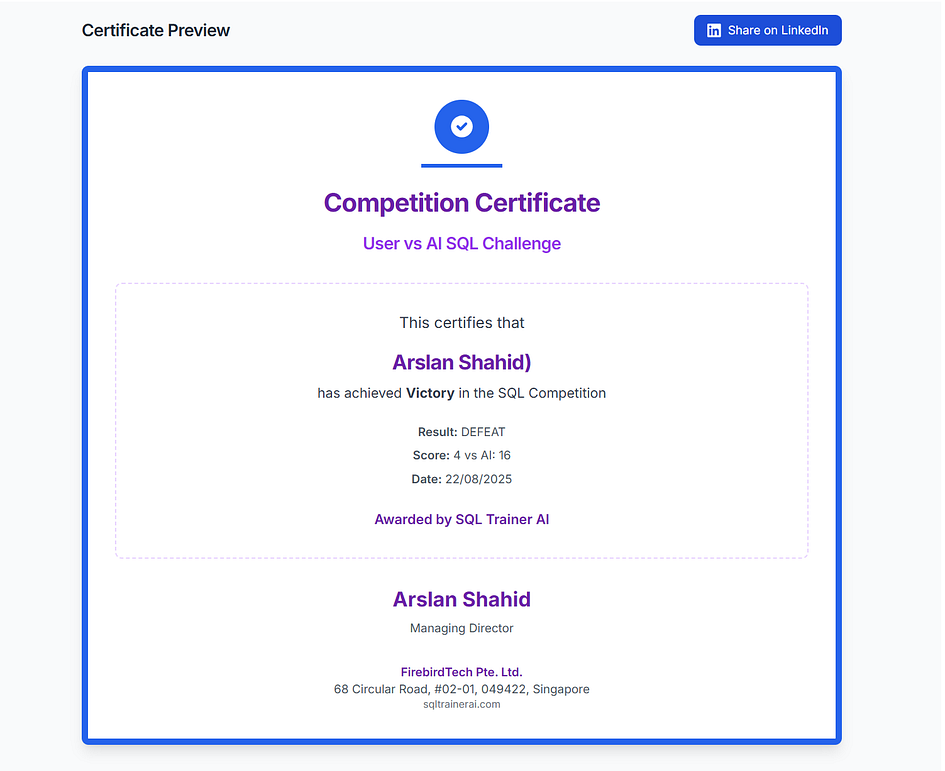 At the end you get a certificate that tells how well you did. You can use these as proof of how good you are at SQL.