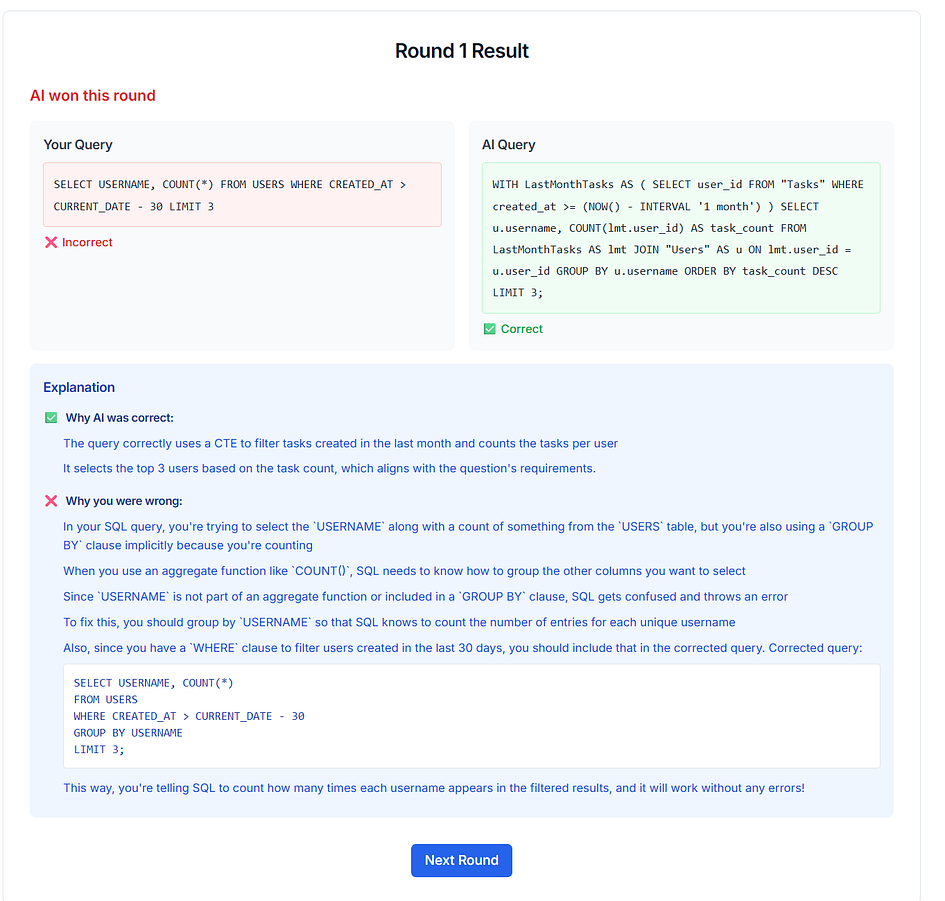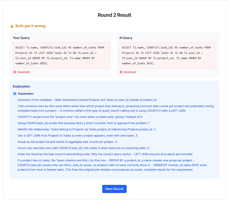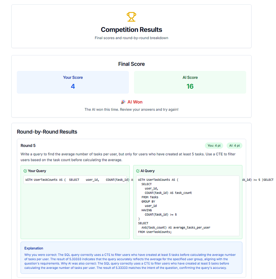 There are two modes of learning for available to the user. One is competitions with our Text2SQL agent and the other are self-serve practice sessions.